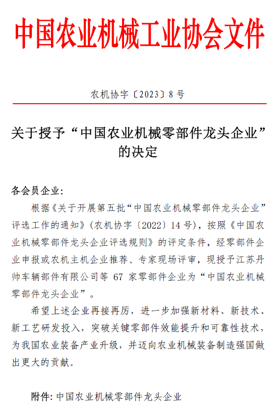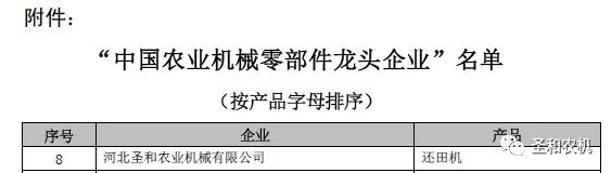 2023年3月9日,中國(guó)農(nóng)業(yè)機(jī)械工業(yè)協(xié)會(huì)發(fā)布關(guān)于授予“中國(guó)農(nóng)業(yè)機(jī)械零部件龍頭企業(yè)”的決定(農(nóng)機(jī)協(xié)字[2023]8號(hào)文件),河北圣和農(nóng)業(yè)機(jī)械有限公司位列榜單,以?xún)?yōu)秀的配套還田機(jī)零部件而著稱(chēng)。