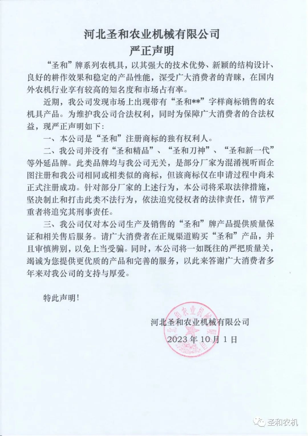 “圣和”牌系列農(nóng)機具,以其強大的技術優(yōu)勢、新穎的結構設計、良好的耕作效果和穩(wěn)定的產(chǎn)品性能,深受廣大消費者的青睞,在國內(nèi)外農(nóng)機行業(yè)享有較高的知名度和市場占有率。 近期,我公司發(fā)現(xiàn)市場上出現(xiàn)帶有“圣和**”字樣商標銷售的農(nóng)機具產(chǎn)品。為維護我公司合法權利,同時為保障廣大消費者的合法權益,現(xiàn)嚴正聲明如下: 一、本公司是“圣和”注冊商標的獨有權利人。 二、我公司并沒有“圣和精品”、“圣和刀神”、“圣和新一代”等外延品牌。此類品牌均與我公司無關,是部分廠家為混淆視聽而企圖注冊和我公司相同或相類似的商標,但該商標僅在申請過程中尚未正式注冊成功。針對部分廠家的上述行為,本公司將采取法律措施,堅決制止和打擊此類不法行為,依法追究侵權者的法律責任,情節(jié)嚴重者將追究其刑事責任。 三、我公司僅對本公司生產(chǎn)及銷售的“圣和”牌產(chǎn)品提供質量保證和相關售后服務。請廣大消費者在正規(guī)渠道購買“圣和”產(chǎn)品,并且審慎辨別,以免上當受騙。同時,本公司將一如既往的嚴把質量關,竭誠為您提供更優(yōu)質的產(chǎn)品和完善的服務,以此來答謝廣大消費者多年來對我公司的支持與厚愛。