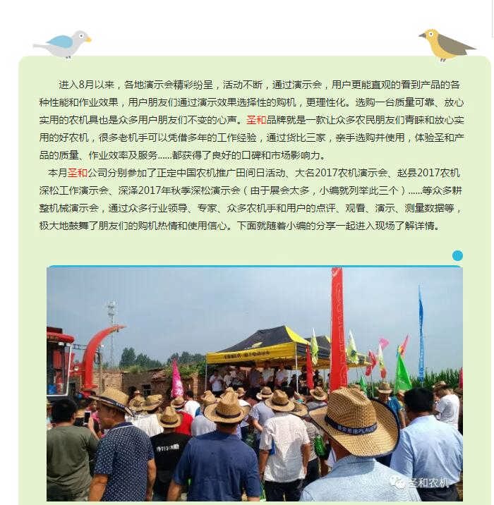 作為國家旋耕機標(biāo)準(zhǔn)起草單位、河北省著名商標(biāo)、河北省優(yōu)質(zhì)產(chǎn)品、更是一家集生產(chǎn)、研發(fā)、流通為一體的科技型企業(yè),深松旋耕機、雙軸滅茬旋耕機安全標(biāo)志及防護裝置示范單位”、“中國旋耕機協(xié)會理事長單位”、“中國農(nóng)業(yè)機械化協(xié)會會員單位”、“中國農(nóng)業(yè)機械流通協(xié)會理事單位”、“河北省生產(chǎn)與流通協(xié)會常務(wù)理事單位”、“河北工業(yè)大學(xué)機械工程學(xué)院-產(chǎn)、學(xué)、研合作基地”,擁有市級研發(fā)中心,公司一直致力于保護性耕整耕種機具的研發(fā),在中國農(nóng)機具研發(fā)領(lǐng)域取得特別優(yōu)異的成果,目前已經(jīng)有近百種的農(nóng)機產(chǎn)品在全國范圍內(nèi)享受農(nóng)機購置補貼,部分產(chǎn)品走出國際市場,遠銷海外,并受到一致好評。不斷更新,不斷完善,不斷進取......立足長遠發(fā)展于未來,圣和-您信賴的農(nóng)機品牌!買農(nóng)機、選圣和!