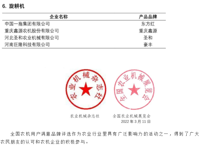 圣和品牌入選“旋耕機(jī)”類(lèi)產(chǎn)品,榮獲第十四屆全國(guó)用戶滿意品牌。