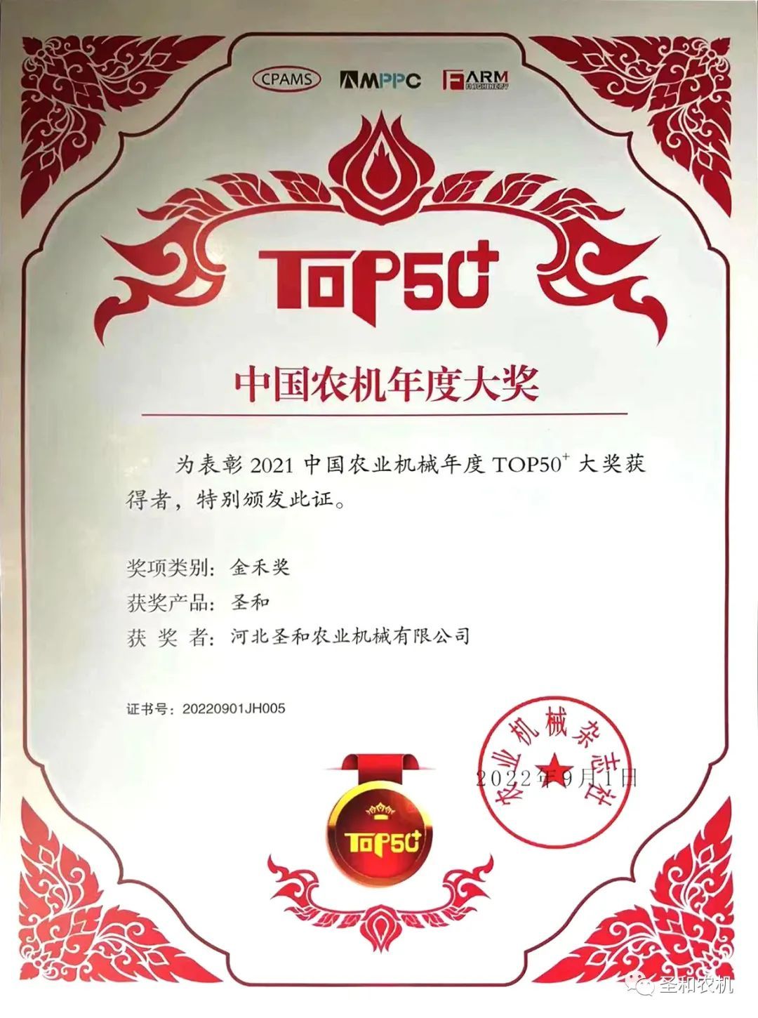 同期舉辦2021中國(guó)農(nóng)業(yè)機(jī)械年度TOP50+頒獎(jiǎng)盛典,河北圣和農(nóng)業(yè)機(jī)械有限公司“圣和”品牌榮獲2021中國(guó)農(nóng)業(yè)機(jī)械年度TOP50+“金禾獎(jiǎng)”。