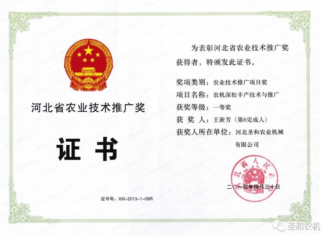 ●2016年,圣和公司研發(fā)中心被邢臺市科技局認(rèn)定為“邢臺市大田耕種機械工程技術(shù)研發(fā)中心”。