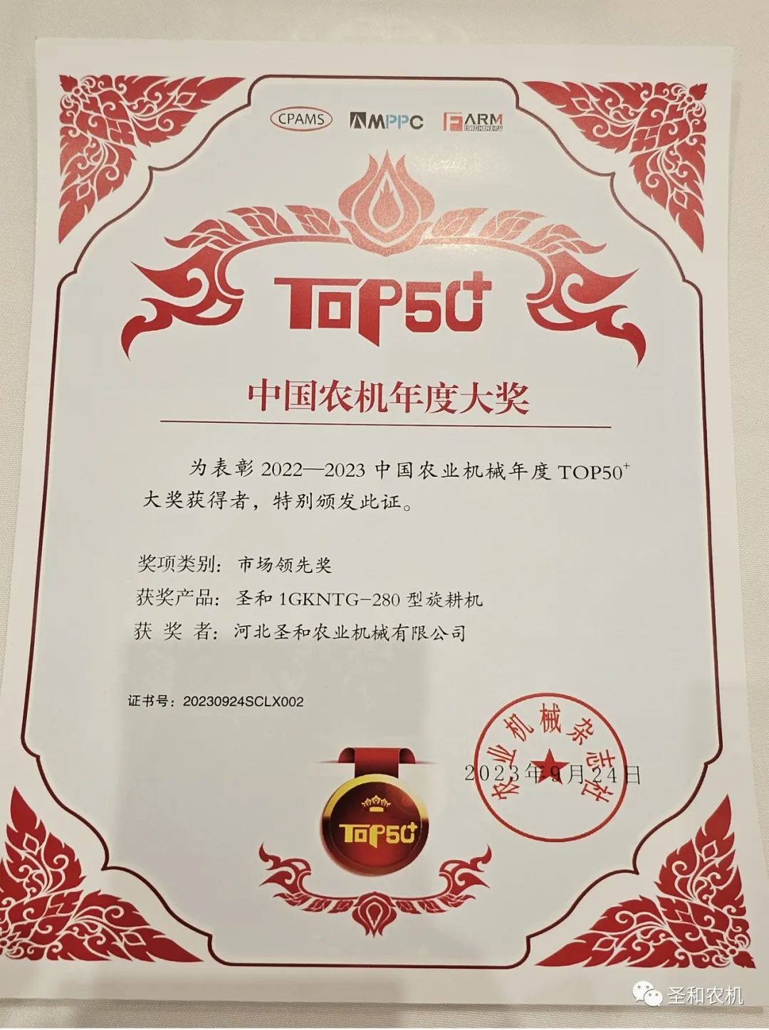 喜報頻傳獲佳績 奮楫揚帆正當(dāng)時----圣和牌旋耕機再度榮獲“市場領(lǐng)先”獎